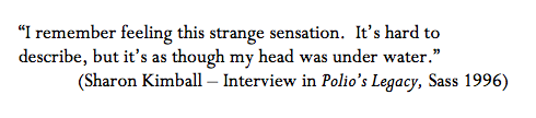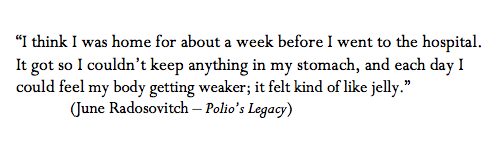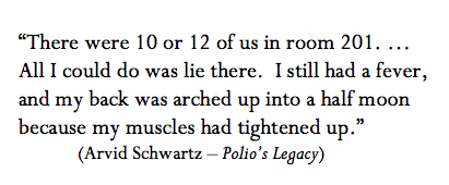 But we have lost sight: of the tremendous impact of this part of our history, and the fact that it happened at all. I read an interview once, in a remarkable compilation of first-person accounts called Polio’s Legacy, in which someone recalled being asked by younger neighbors if his children were “okay;” presumably they thought that the “polio” that kept him in leg braces was hereditary, or somehow still catching.